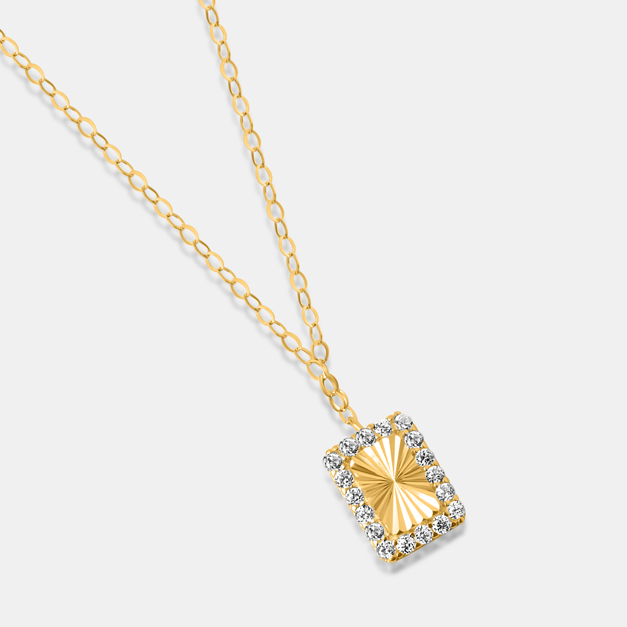 This elegant necklace features a delicate gold chain and a rectangular pendant with a unique textured gold center. The center, with its subtle crimson undertones, catches the light beautifully, creating a warm, radiant glow. A halo of sparkling stones surrounds the center, adding brilliance and depth. This piece is perfect for both everyday wear and special occasion.