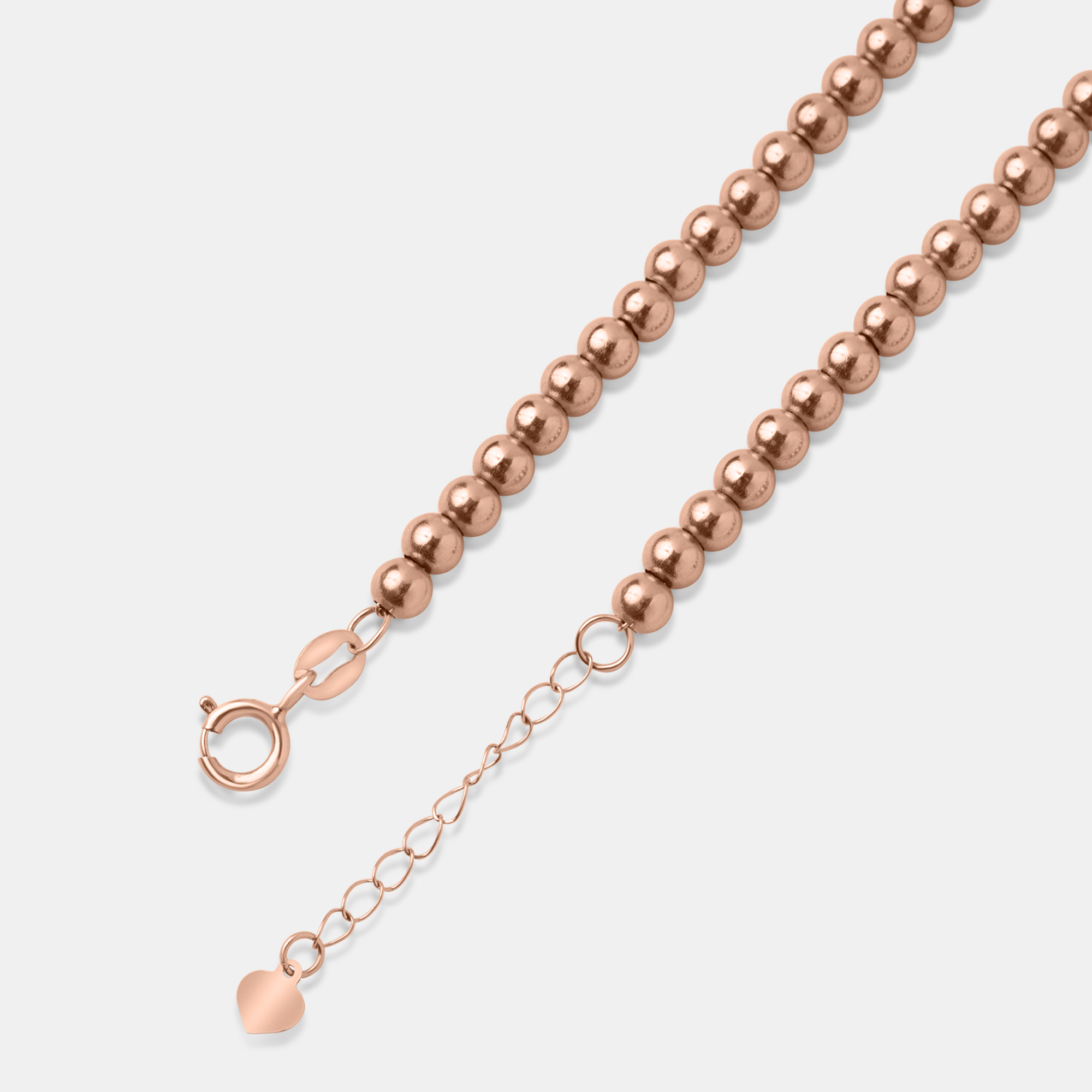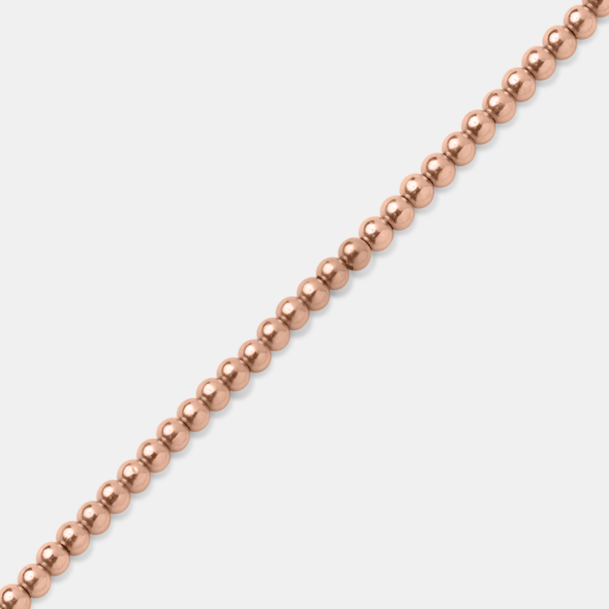 This is a delicate 18k rose gold bead bracelet, featuring uniformly sized, polished spheres strung together for a minimalist yet elegant look. The warm, rosy hue of the gold adds a touch of subtle sophistication, making it perfect for both everyday wear and special occasions. Its simple design allows for easy stacking with other bracelets or wearing alone for a refined statement.