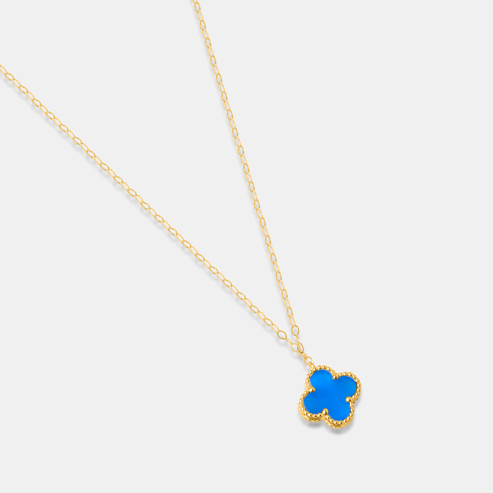 Embrace a touch of vibrant elegance with this delicate gold pendant. Featuring a striking four-leaf clover motif in a rich azure blue, this piece adds a pop of color and a hint of playful sophistication to any ensemble. The clover is delicately outlined in a fine gold trim, adding a touch of classic refinement. Suspended from a slender gold chain, this necklace is perfect for everyday wear or for adding a special touch to an evening look. Its timeless design makes it a cherished addition to any jewelry collection.