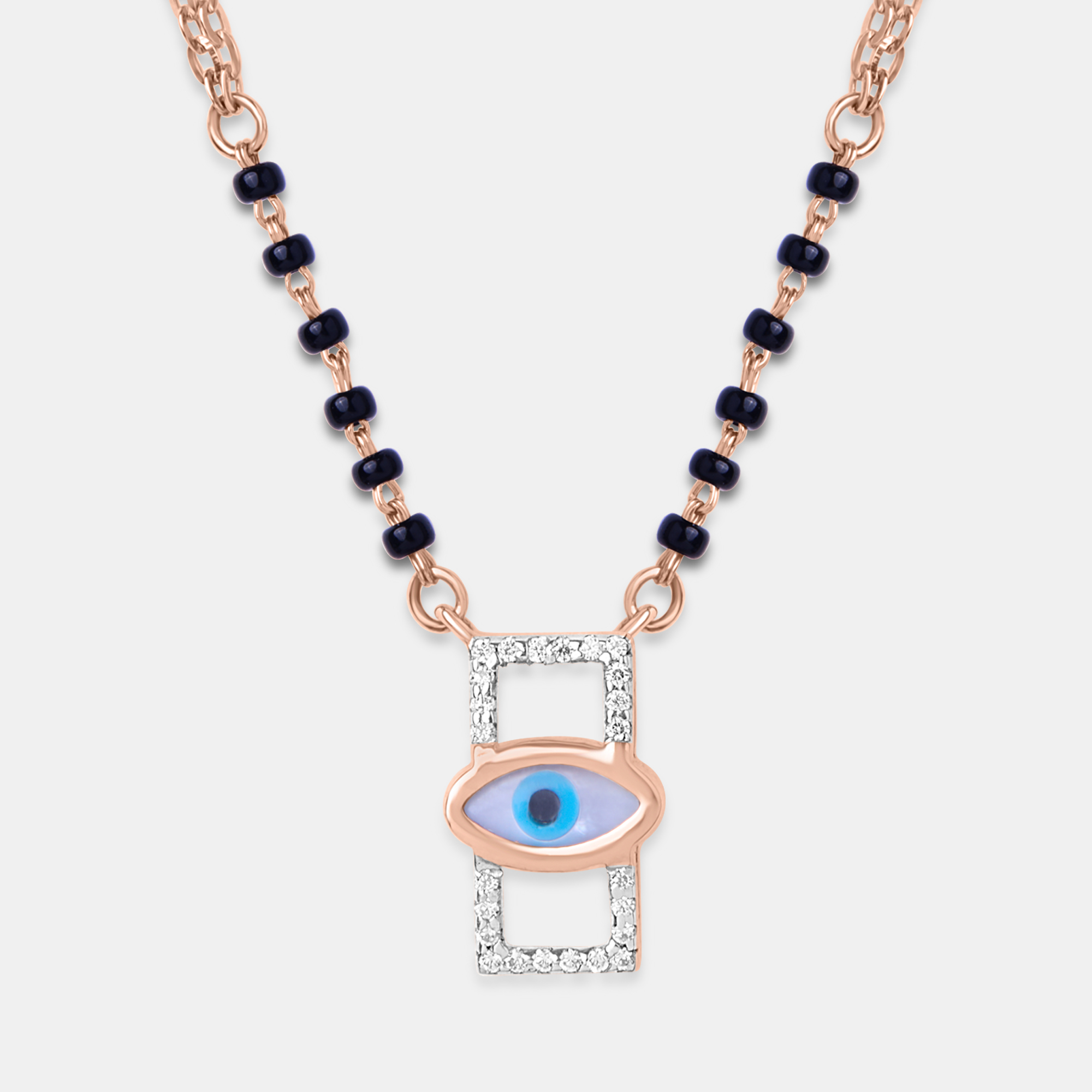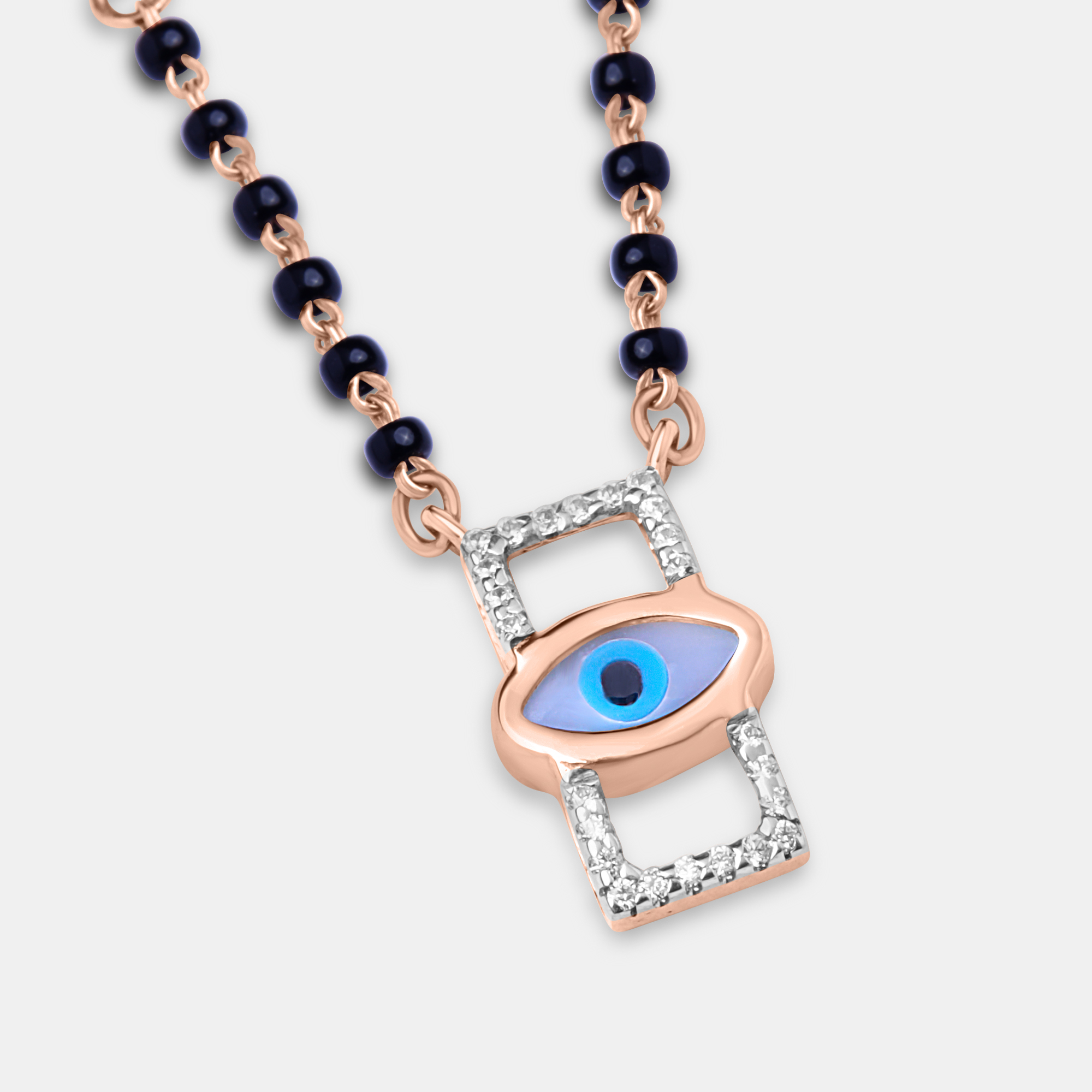 This captivating rose gold chain features a contemporary evil eye charm set within a sparkling rectangular frame, adorned with black beads, offering a unique blend of traditional protection and modern style.