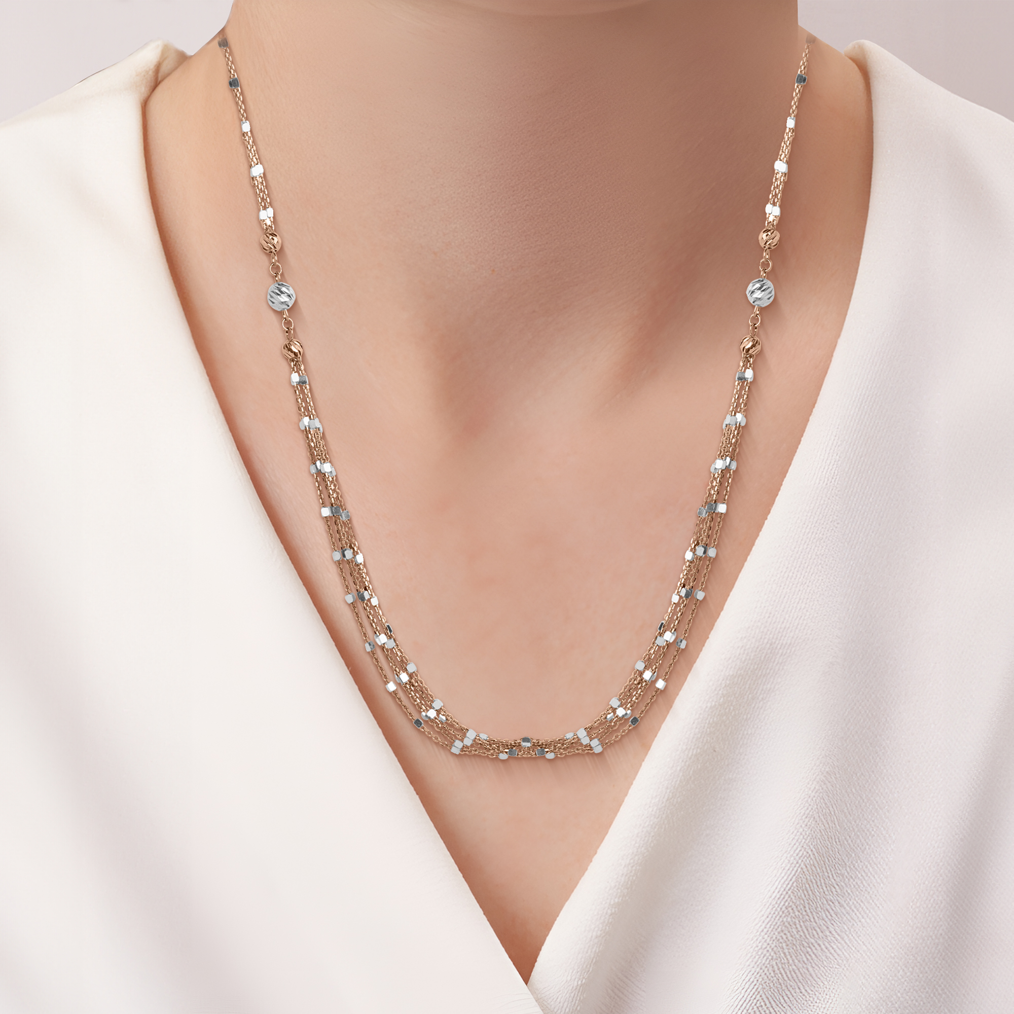 This exquisite multi-strand necklace features delicate chains in a harmonious blend of rose and white gold tones, adorned with beautifully textured spherical beads for a sophisticated and layered look.