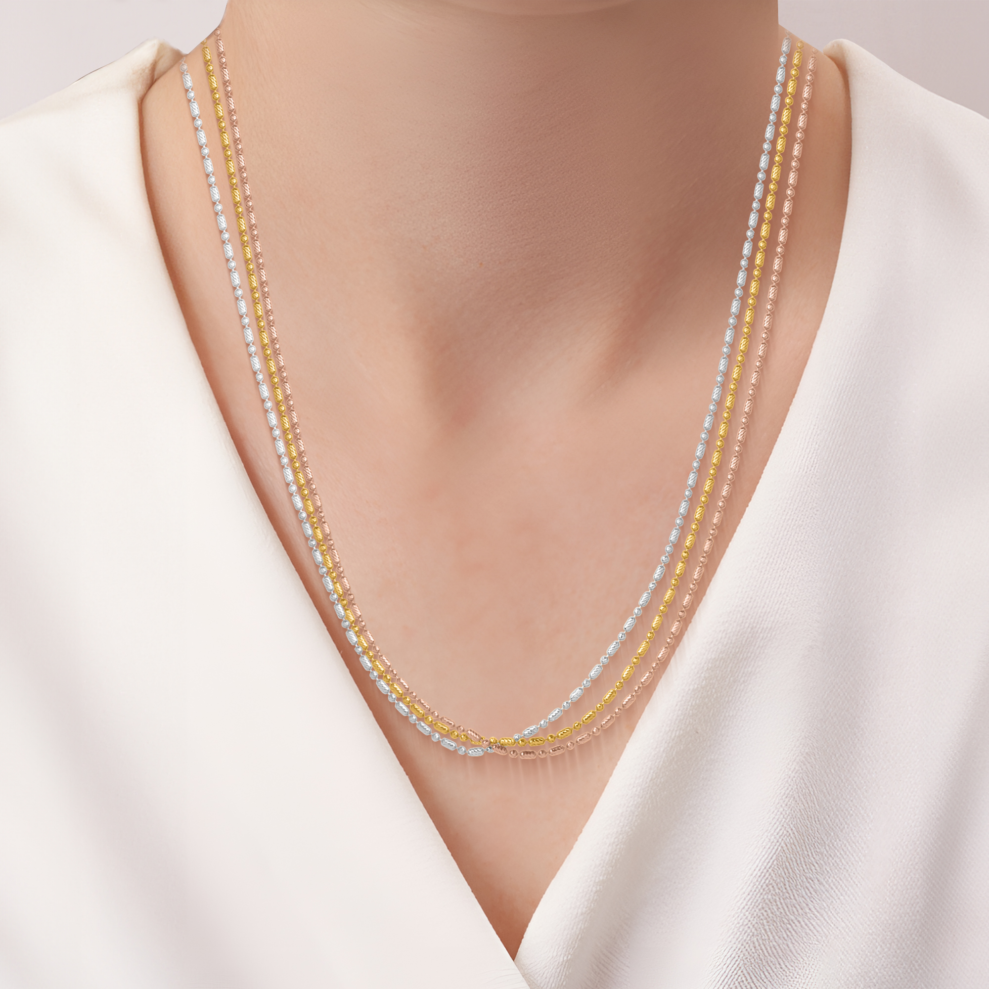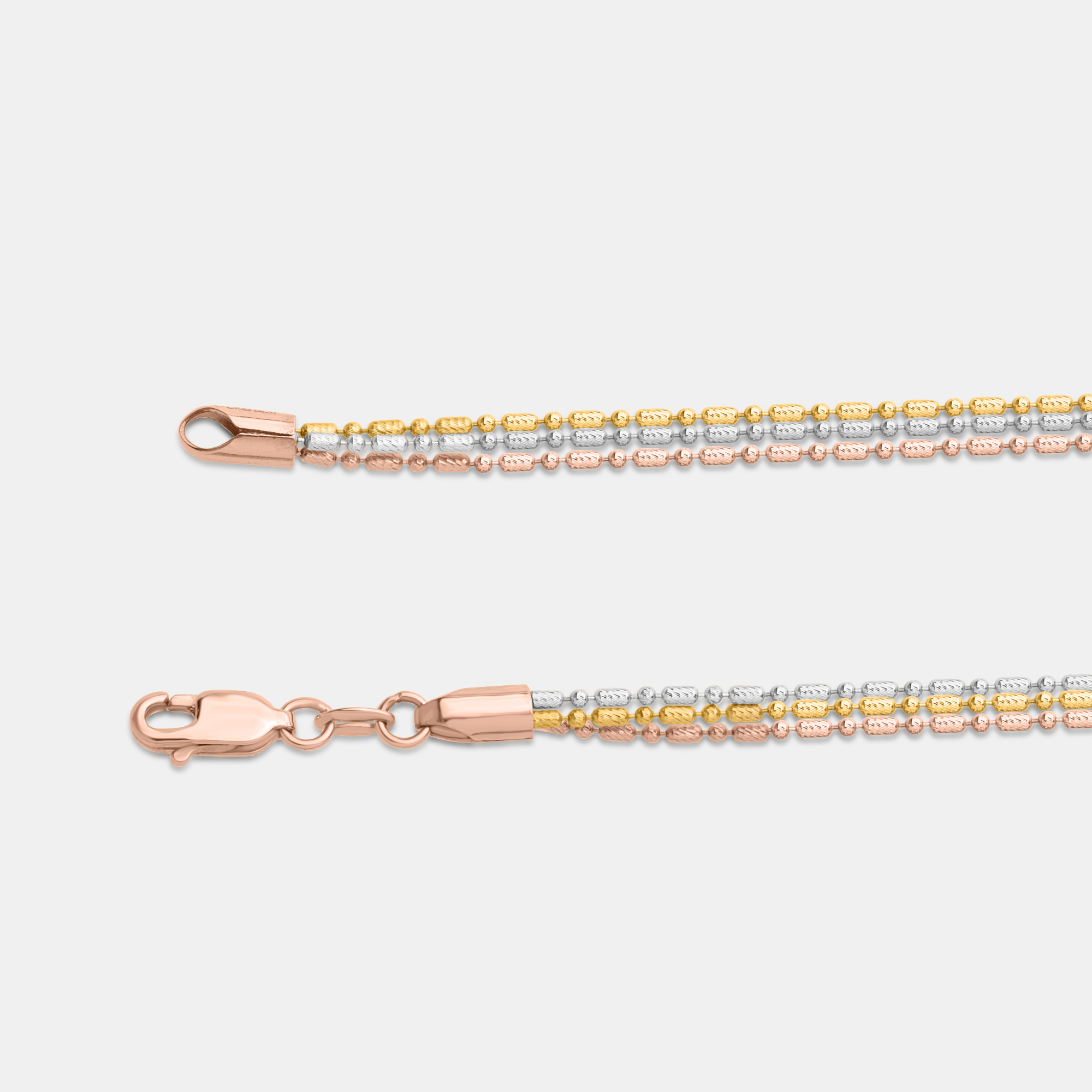 This elegant multi-strand chain beautifully blends white, rose, and yellow gold tones, offering a sophisticated and versatile accessory that adds depth and radiance to any ensemble.