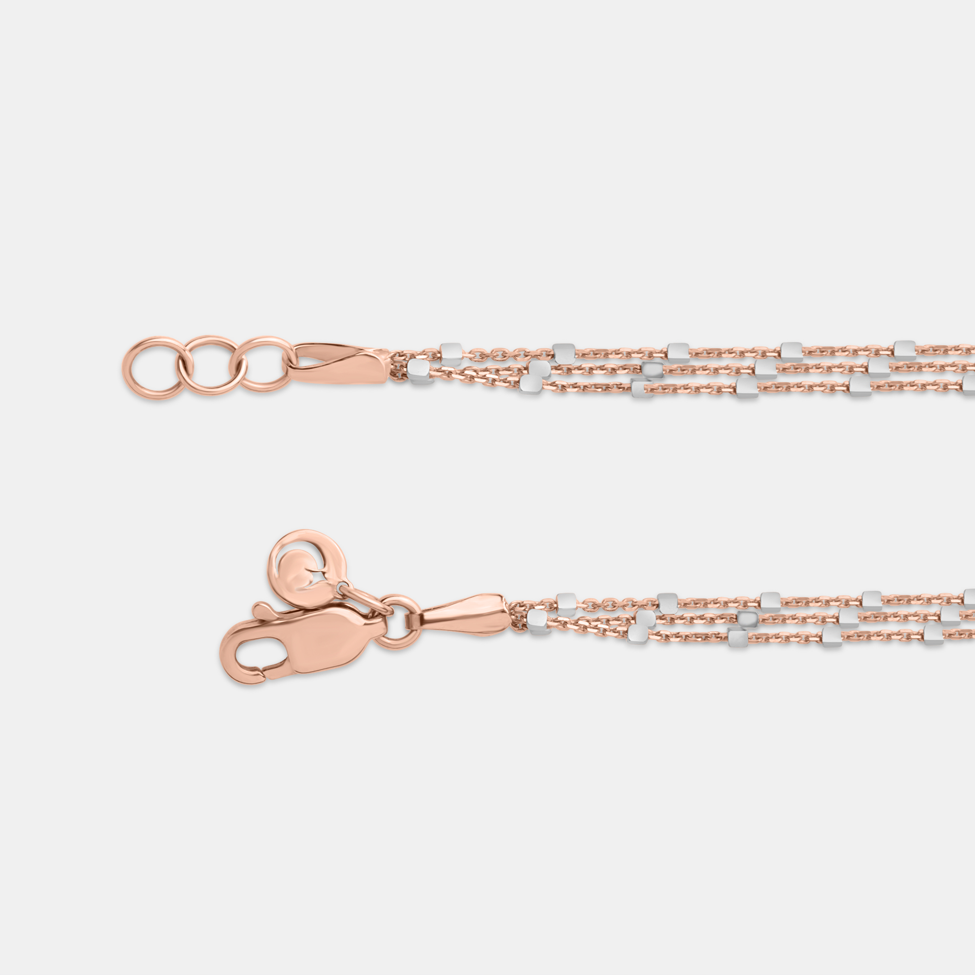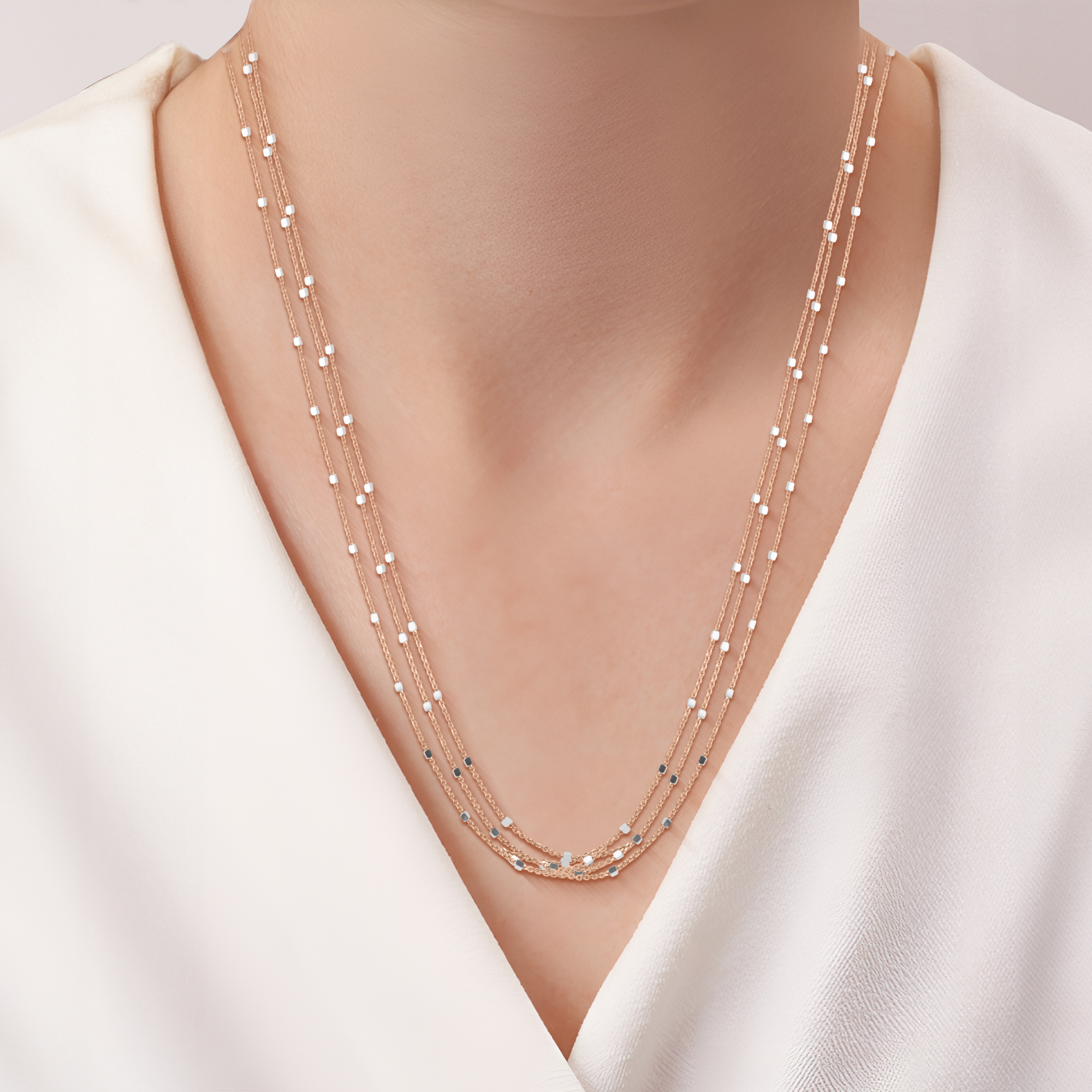 This delicate multi-strand chain features an intricate weave of tiny rose and white gold beads, creating a subtle shimmer and a refined, textured look that's perfect for effortless elegance.