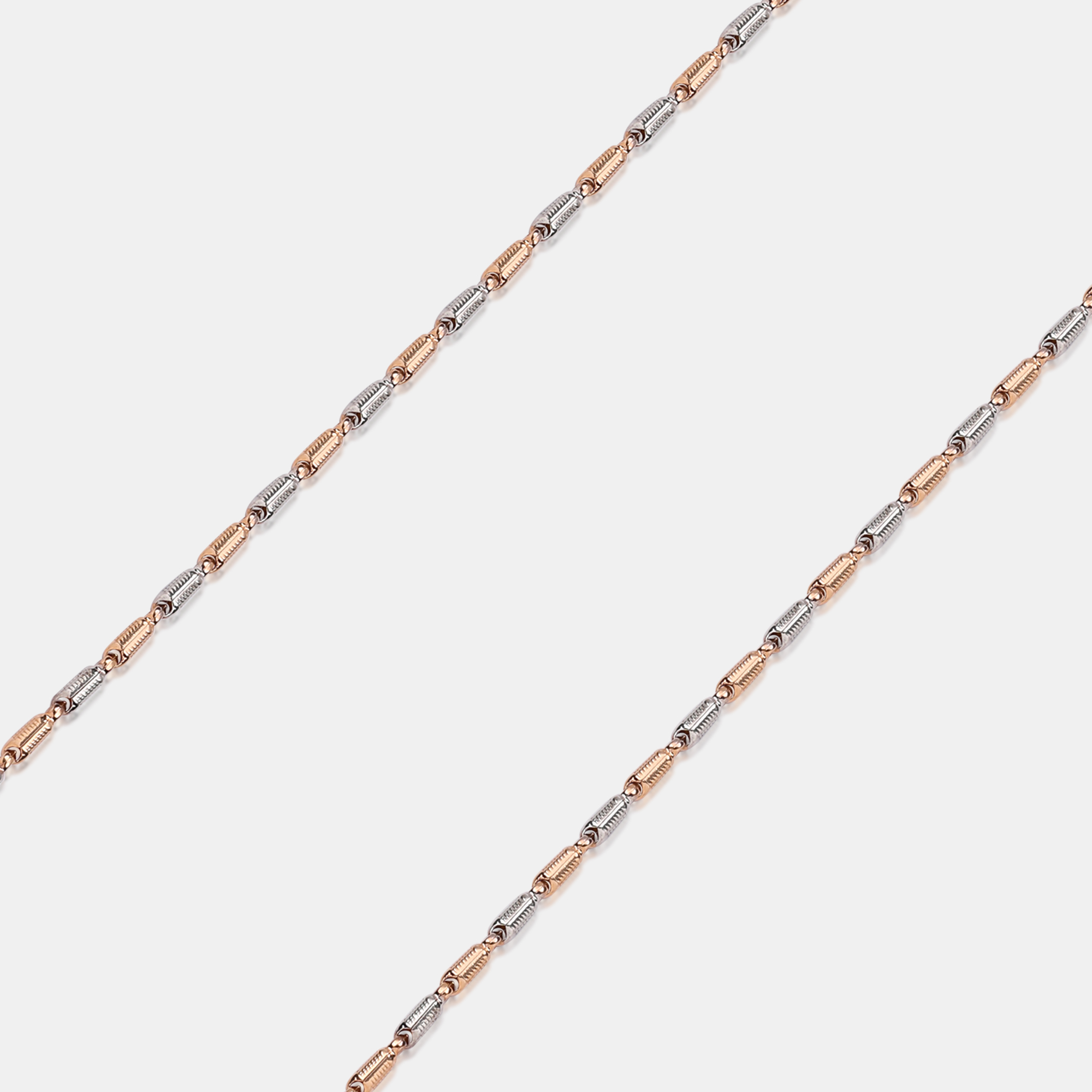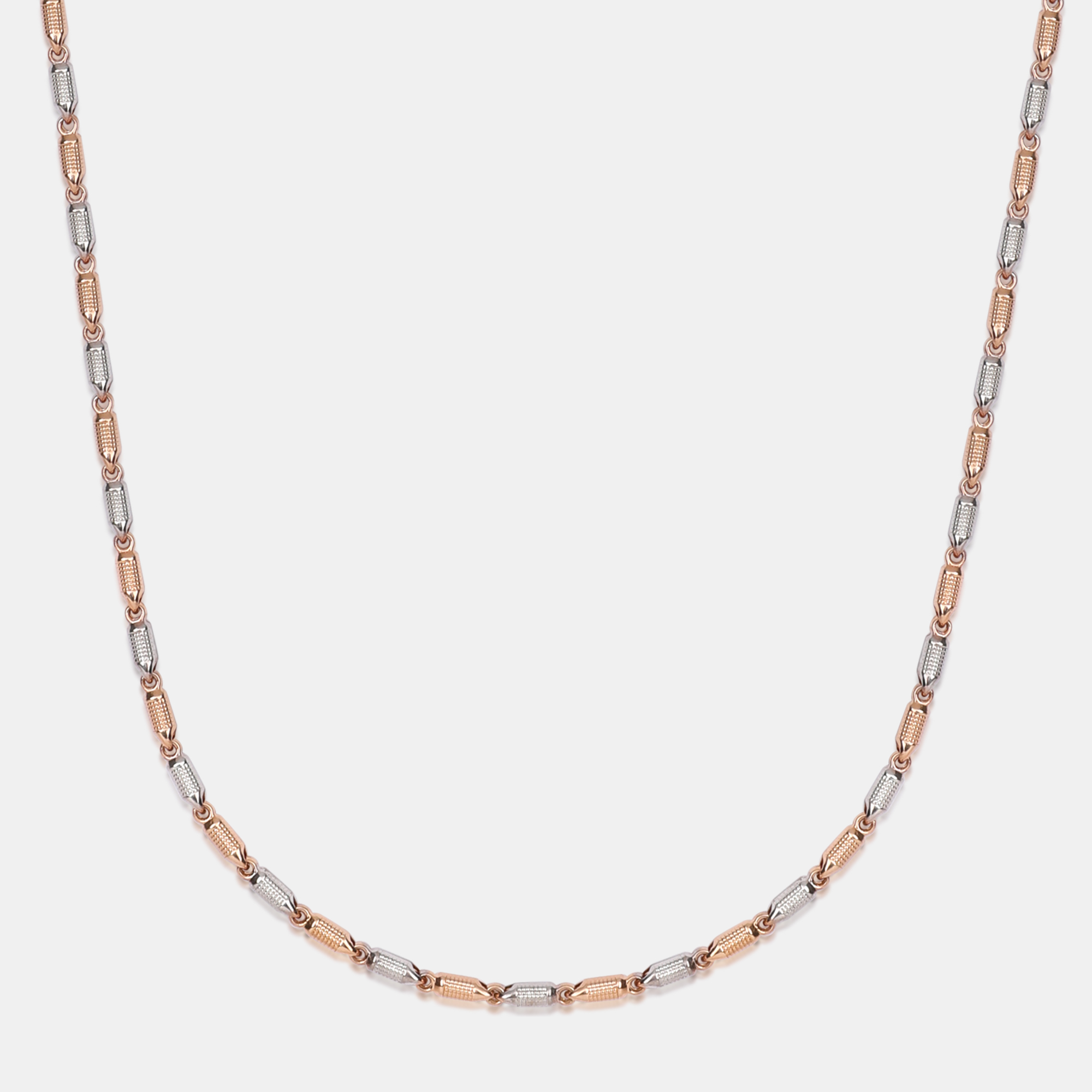 This necklace features a repeating pattern of alternating rose gold and white gold barrel-shaped links. Its minimalist design offers a modern, two-tone aesthetic. Perfect for layering or wearing alone for a subtle, sophisticated touch.