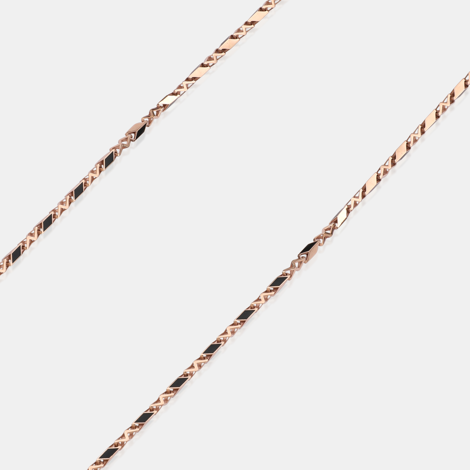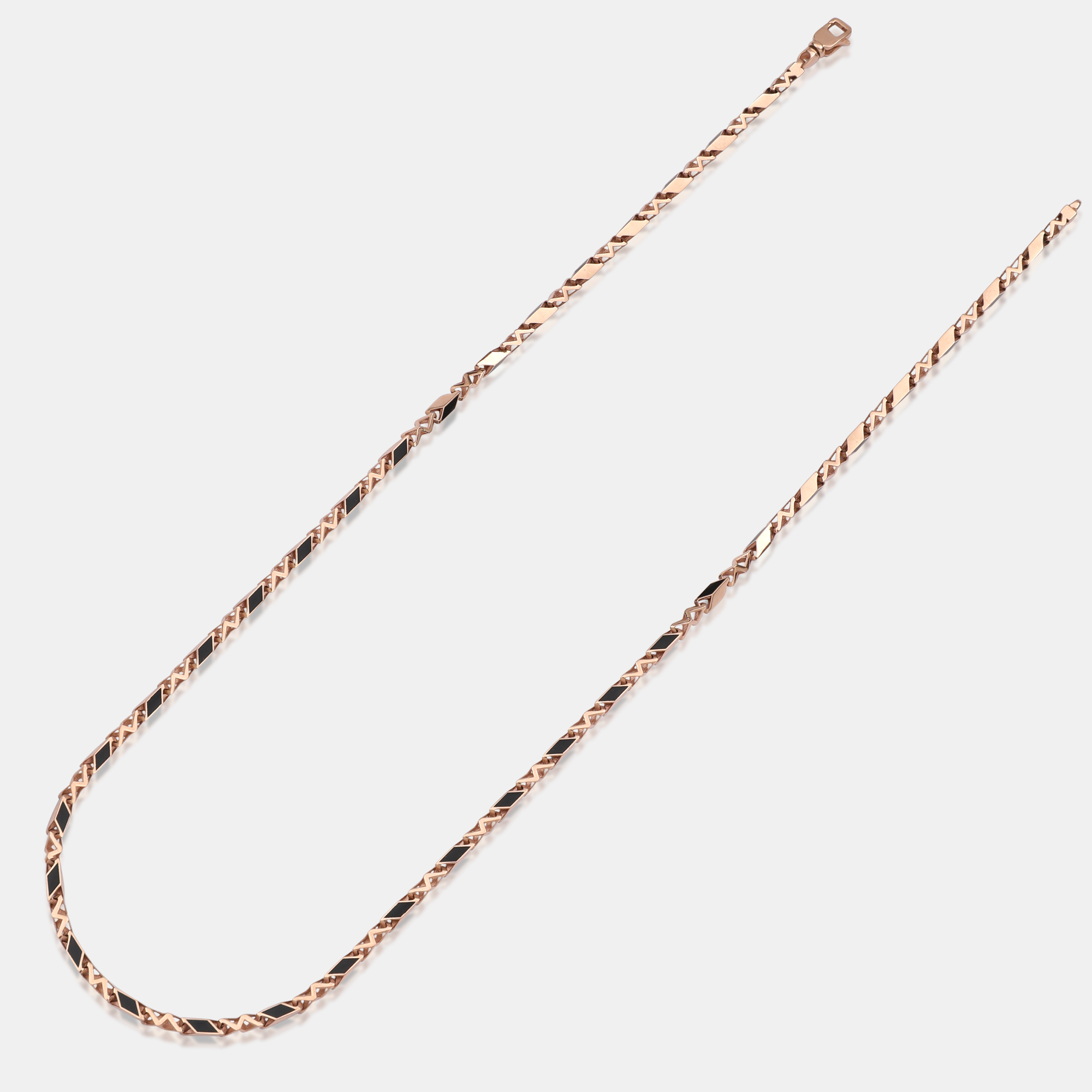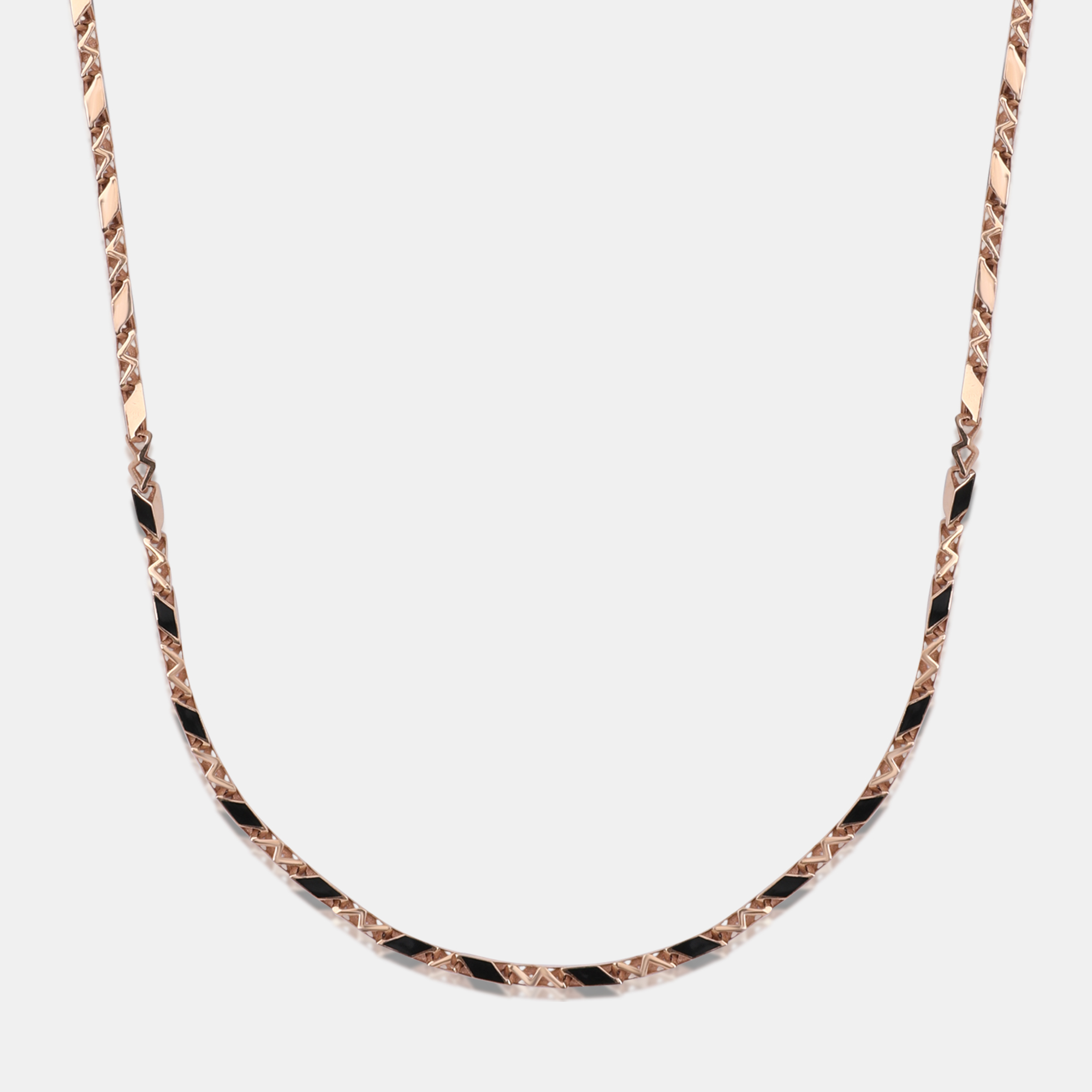 This necklace features a sleek herringbone design in polished rose gold, accented with black enamel details. The flat, interwoven links create a smooth, elegant drape. Perfect for adding a touch of modern sophistication to any neckline.