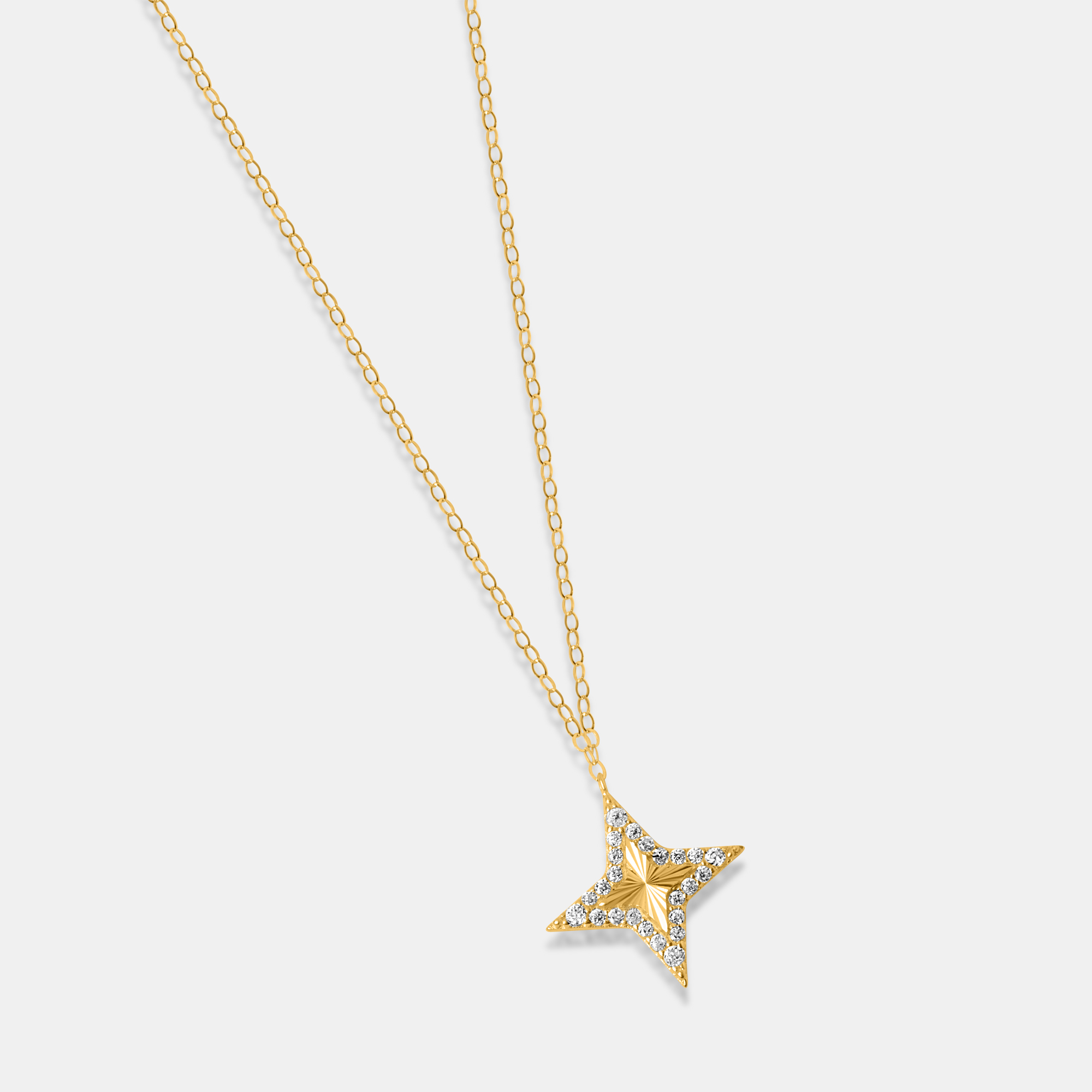 This elegant necklace features a delicate 18kt gold chain and a striking star-shaped pendant. The pendant showcases a textured gold center, surrounded by a sparkling halo of crystals. The geometric design and radiant sparkle make this necklace a captivating statement piece.
