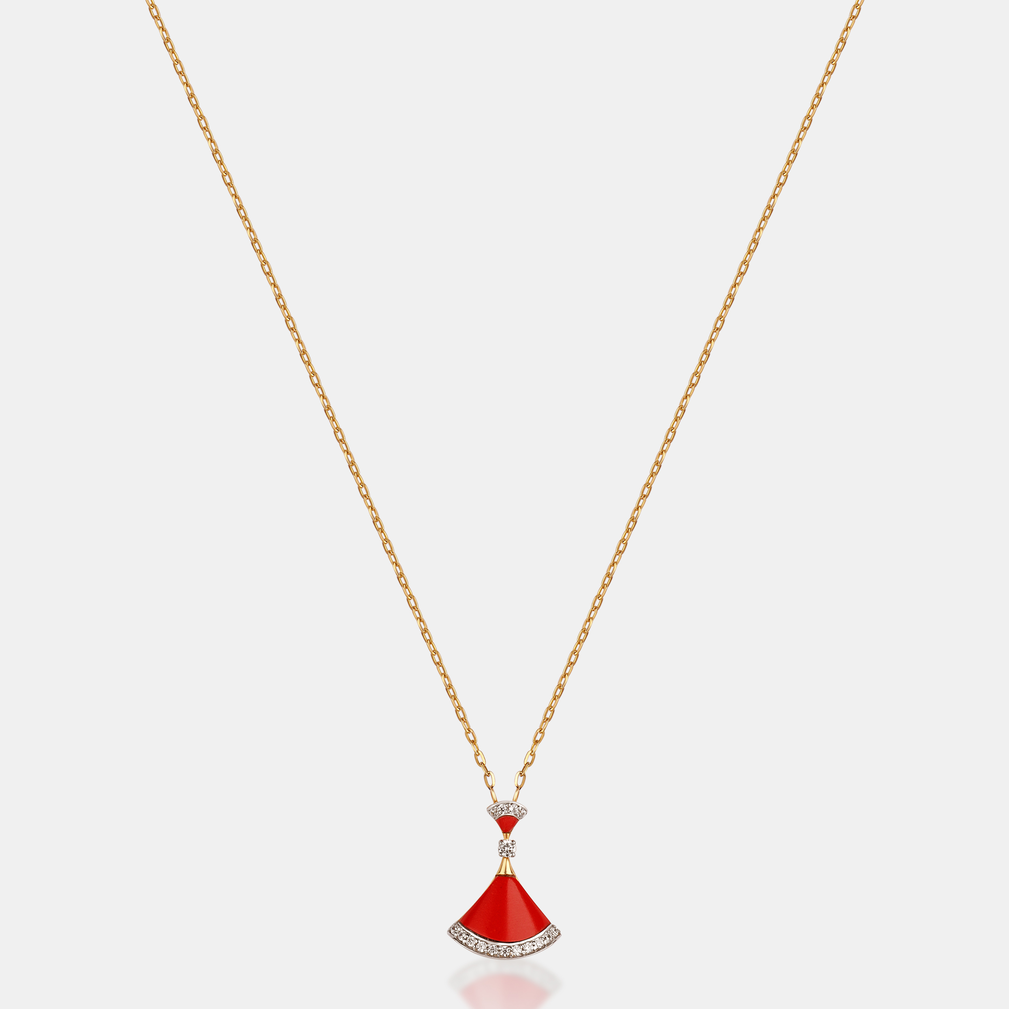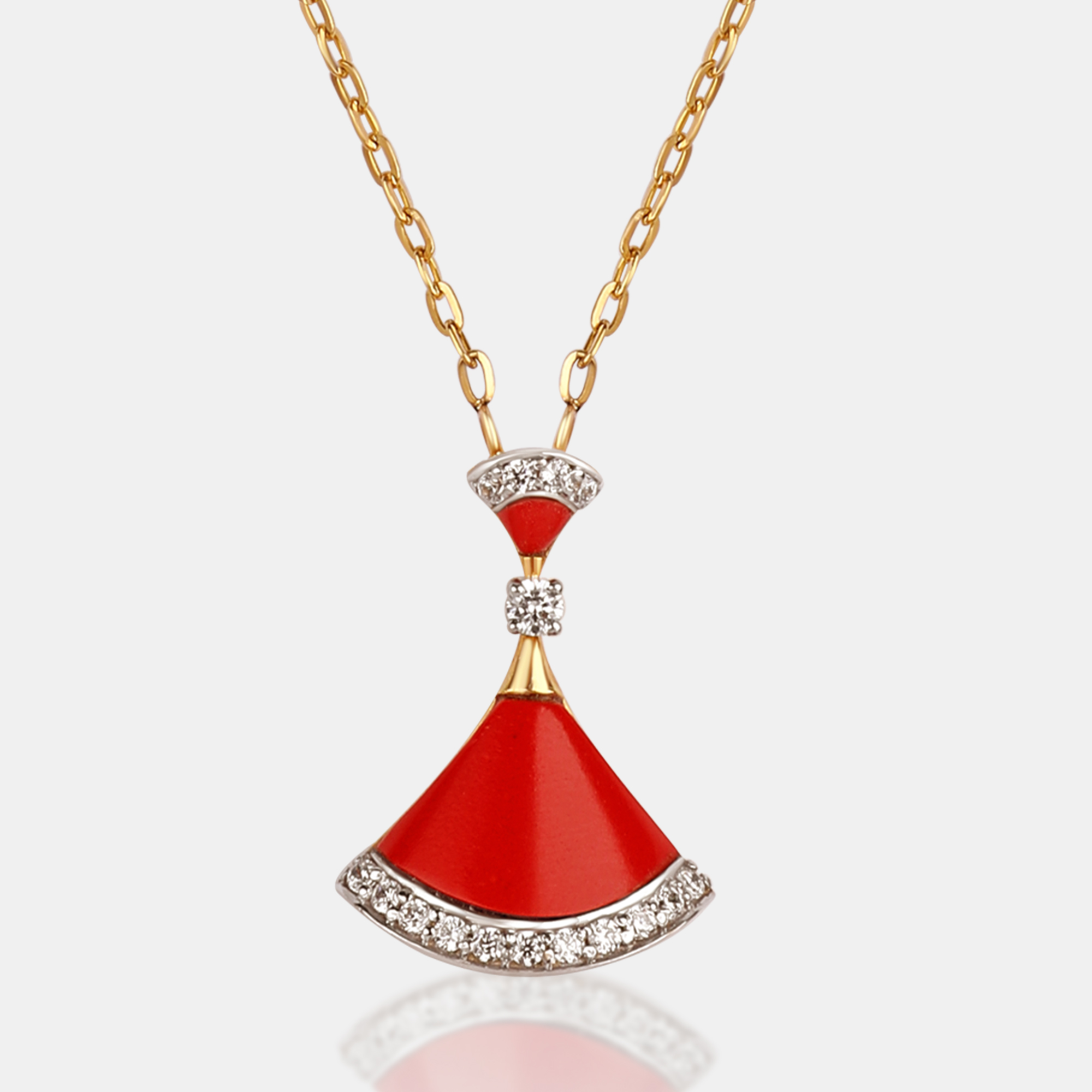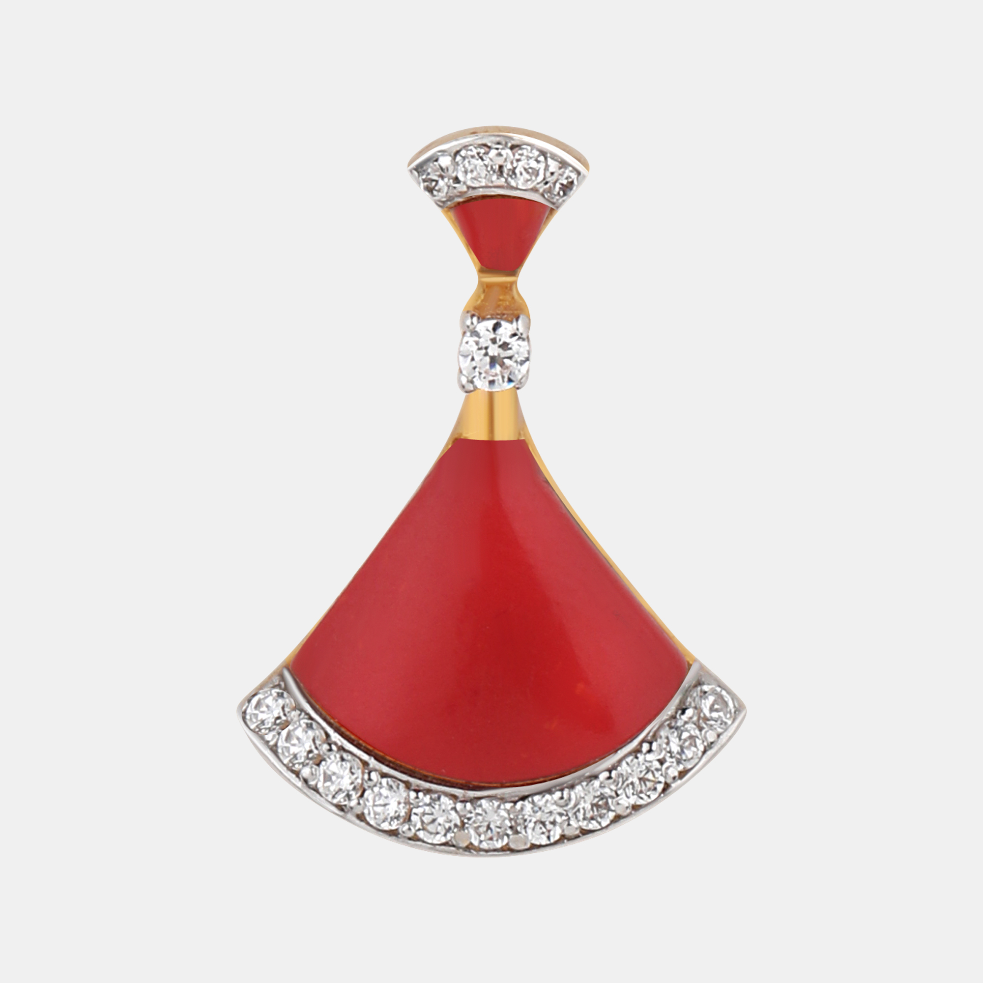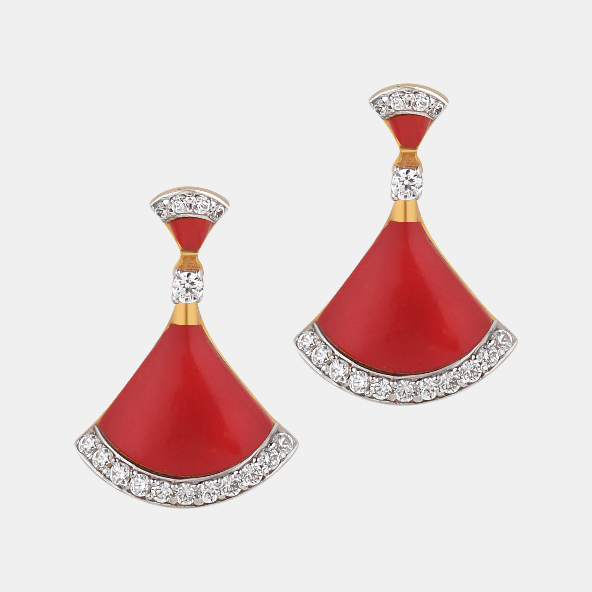 These striking earrings feature a fan-shaped design with vibrant red enamel, framed by sparkling diamonds. A Czs accent connects the fan to a smaller, Czs-studded segment. Their Art Deco-inspired style adds a touch of vintage glamour.