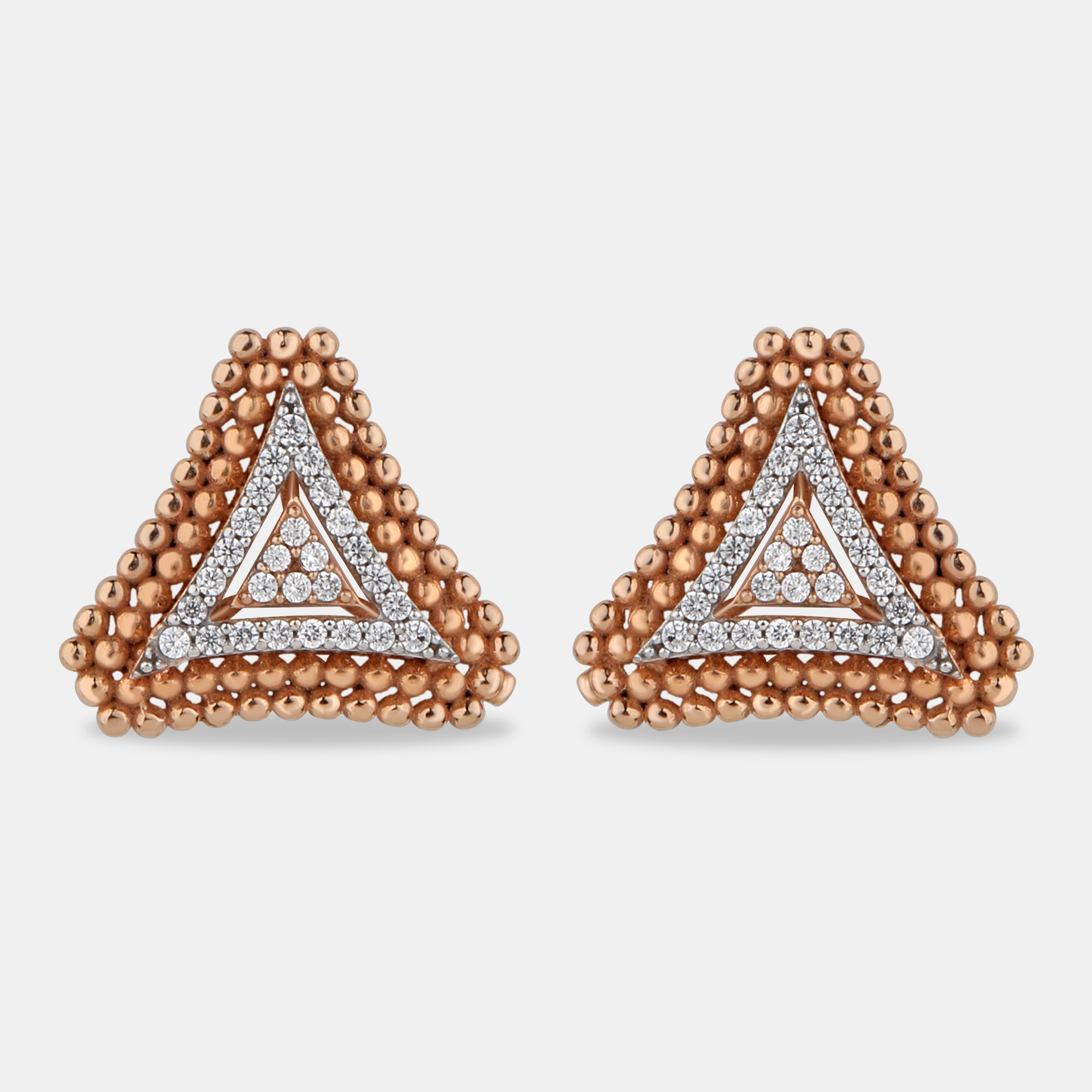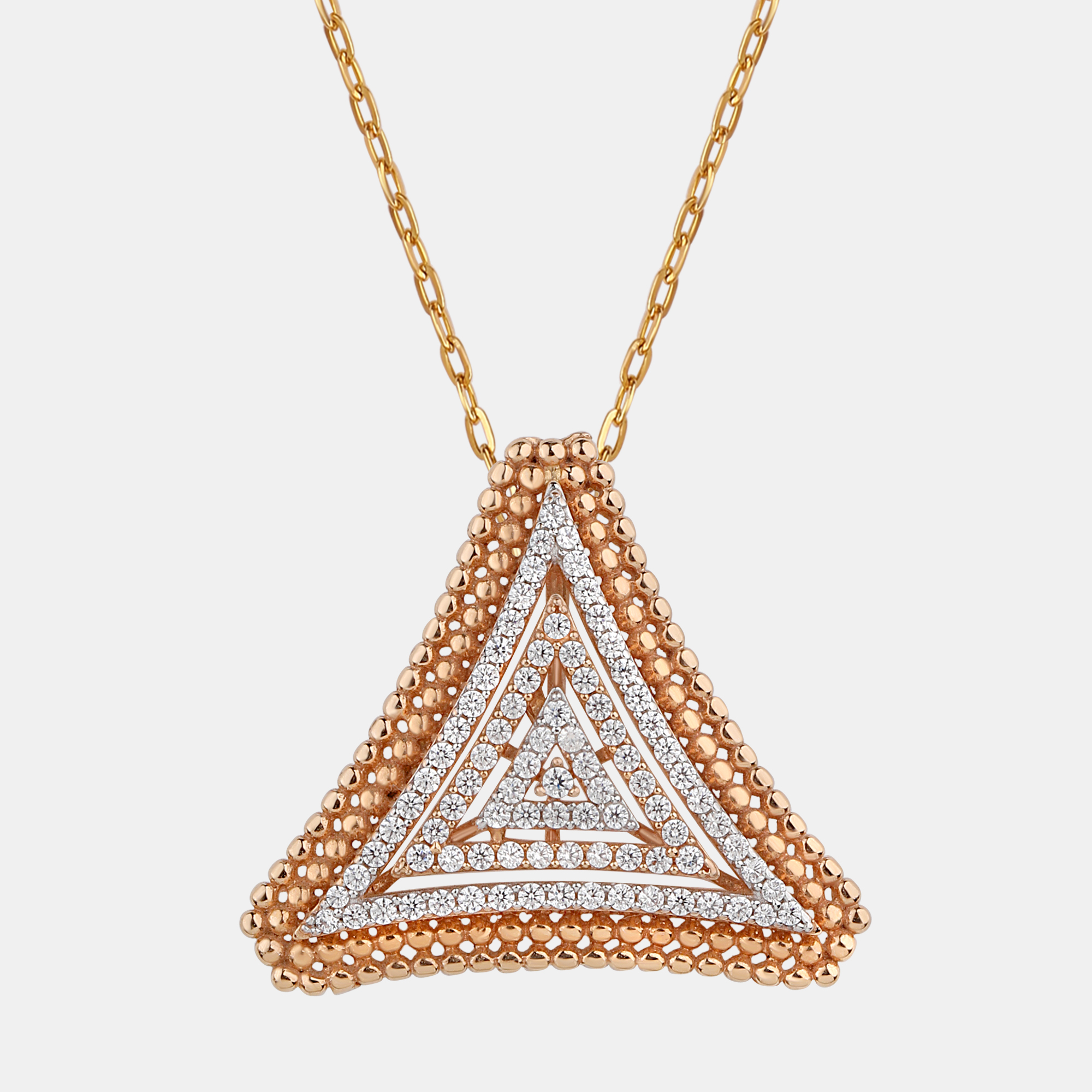 This striking jewelry set features a bold and modern triangular design. The pendant and matching earrings showcase a layered effect, with a central inverted triangle paved with sparkling cubic CZ diamond, framed by rows of textured rose-gold toned beads. The contrast between the shimmering stones and the tactile beads creates a captivating visual appeal. The pendant gracefully hangs from a delicate gold-toned chain, while the earrings offer a stylish and comfortable fit. This set is perfect for adding a touch of contemporary glamour and geometric flair to any look.