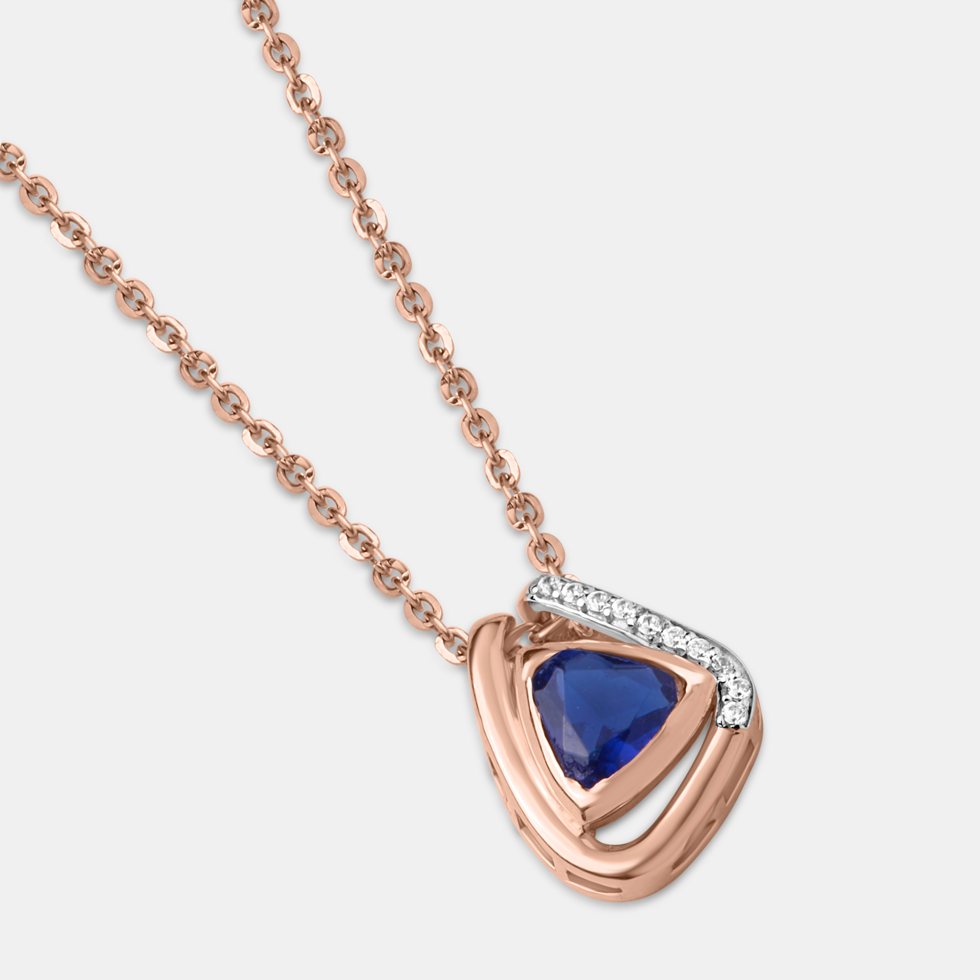 The Midnight Allure Set features a captivating deep blue stone cradled within sleek rose gold curves and shimmering diamonds. A perfect fusion of contemporary grace and striking charm.